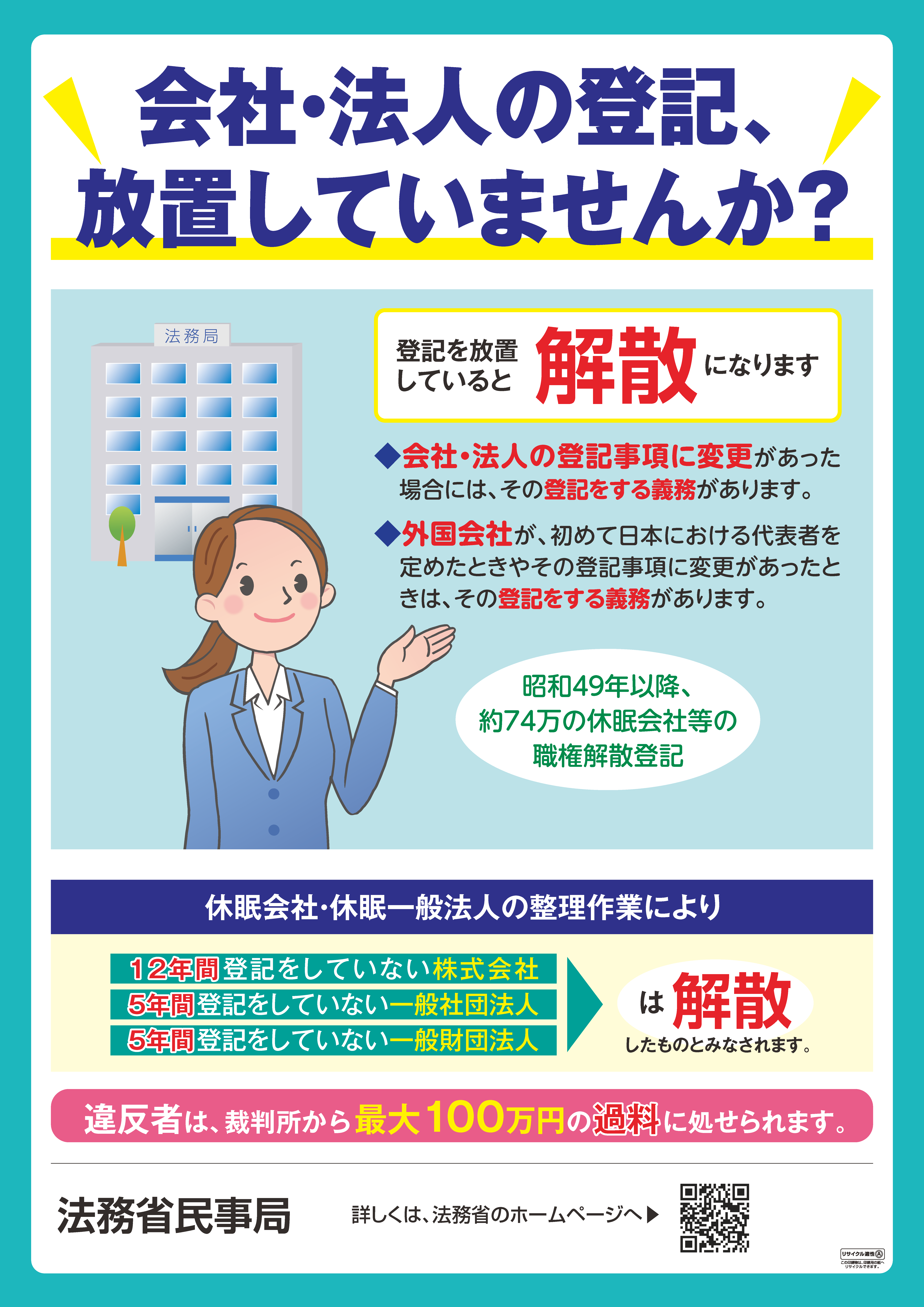 12年以上の間、登記がされていない株式会社については、法務局はいったん会社または代表者宛てに、もう活動していないのであれば解散登記をしますよ、という通知を送り、返答がなければ解散登記をすることが可能になっています。