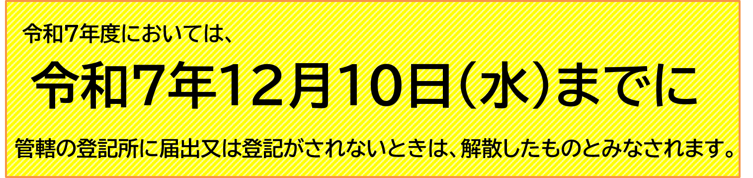 ★令和7年12月10日(水)までに必要な登記(役員変更等)の申請又は「まだ事業を廃止していない」旨の届出をしない限り、同月11日(木)付けで解散したものとみなされ、職権で解散の登記がされますので、御注意ください。